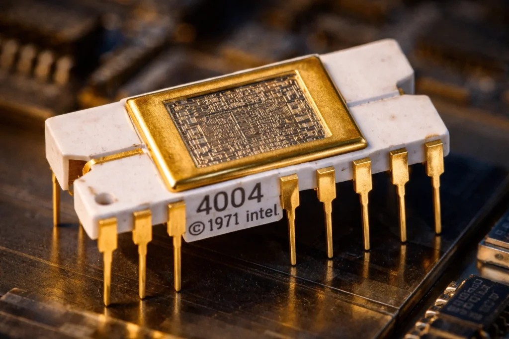 A história é curiosa: uma empresa japonesa chamada Busicom pediu à Intel que criasse 12 chips personalizados para uma nova calculadora. Em vez de fazer 12 peças diferentes, o engenheiro Federico Faggin e sua equipe tiveram uma ideia melhor: criar um dispositivo único e “geral” que pudesse ser programado para várias funções.